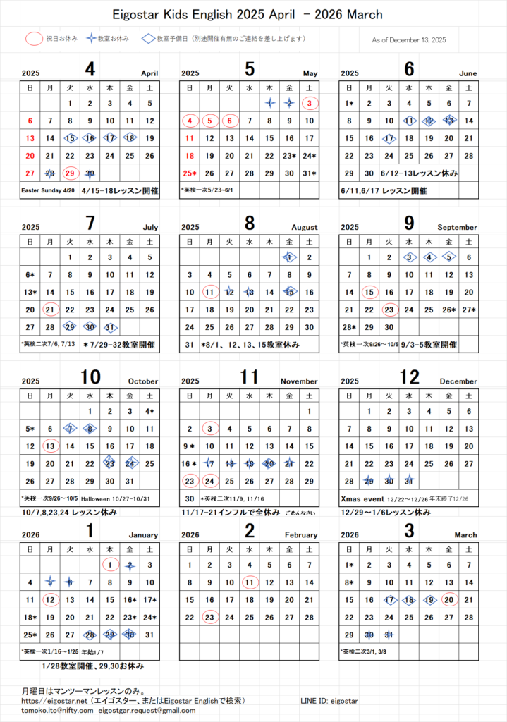 グループレッスンの最終日は12月26日(金)です。
