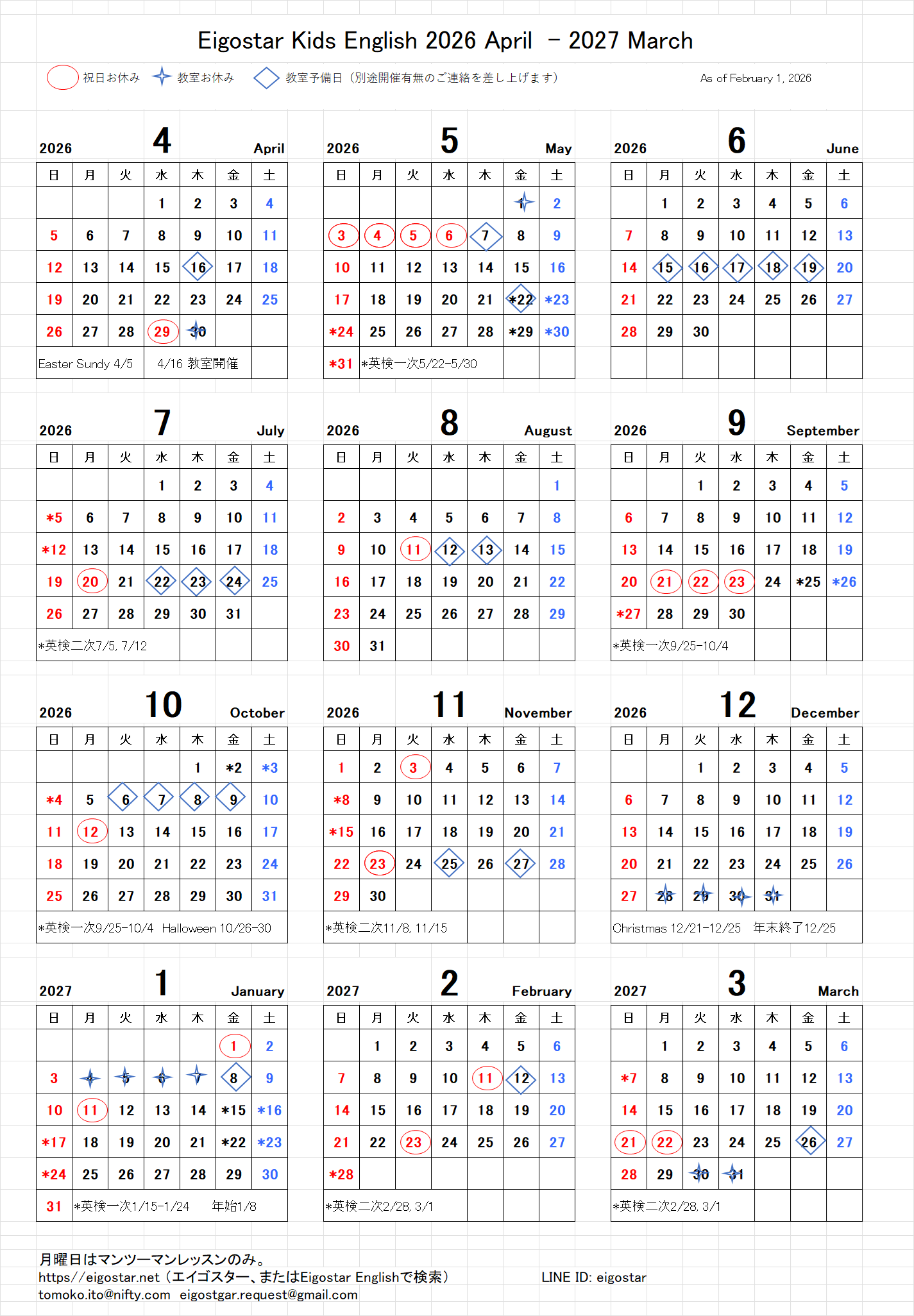 2026/03/18 / 最終更新日時 : 2026/03/18 eigostar こども英語教室Kids English 2026年4月~2027年3月までのKIDS English年間カレンダー 2026年度の年間カレンダーです BlueskyCopy コメントを残す コメントをキャンセルメールアドレスが公開されることはありません。 ※ が付いている欄は必須項目ですコメント ※ 名前 ※ メール ※ サイト Δ